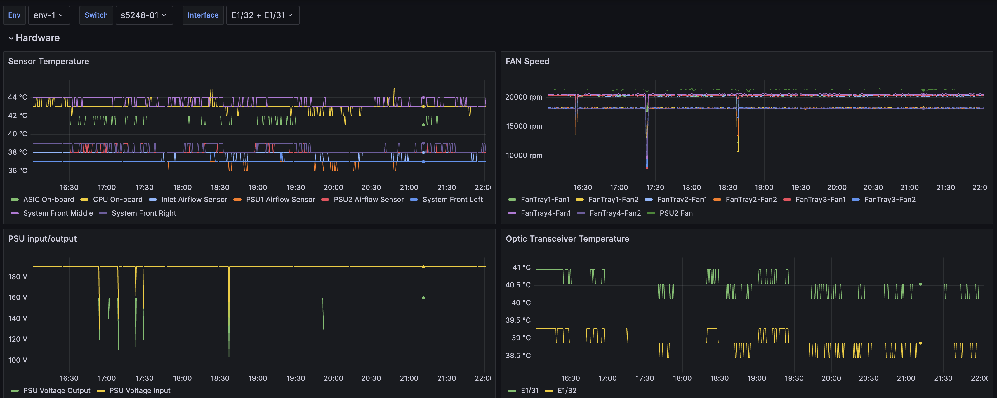 To provide monitoring for most critical metrics from the switches managed by Hedgehog Fabric there are several Dashboards that may be used in Grafana deployments. Make sure that you've enabled metrics and logs collection for the switches in the Fabric that is described in Fabric Config section.